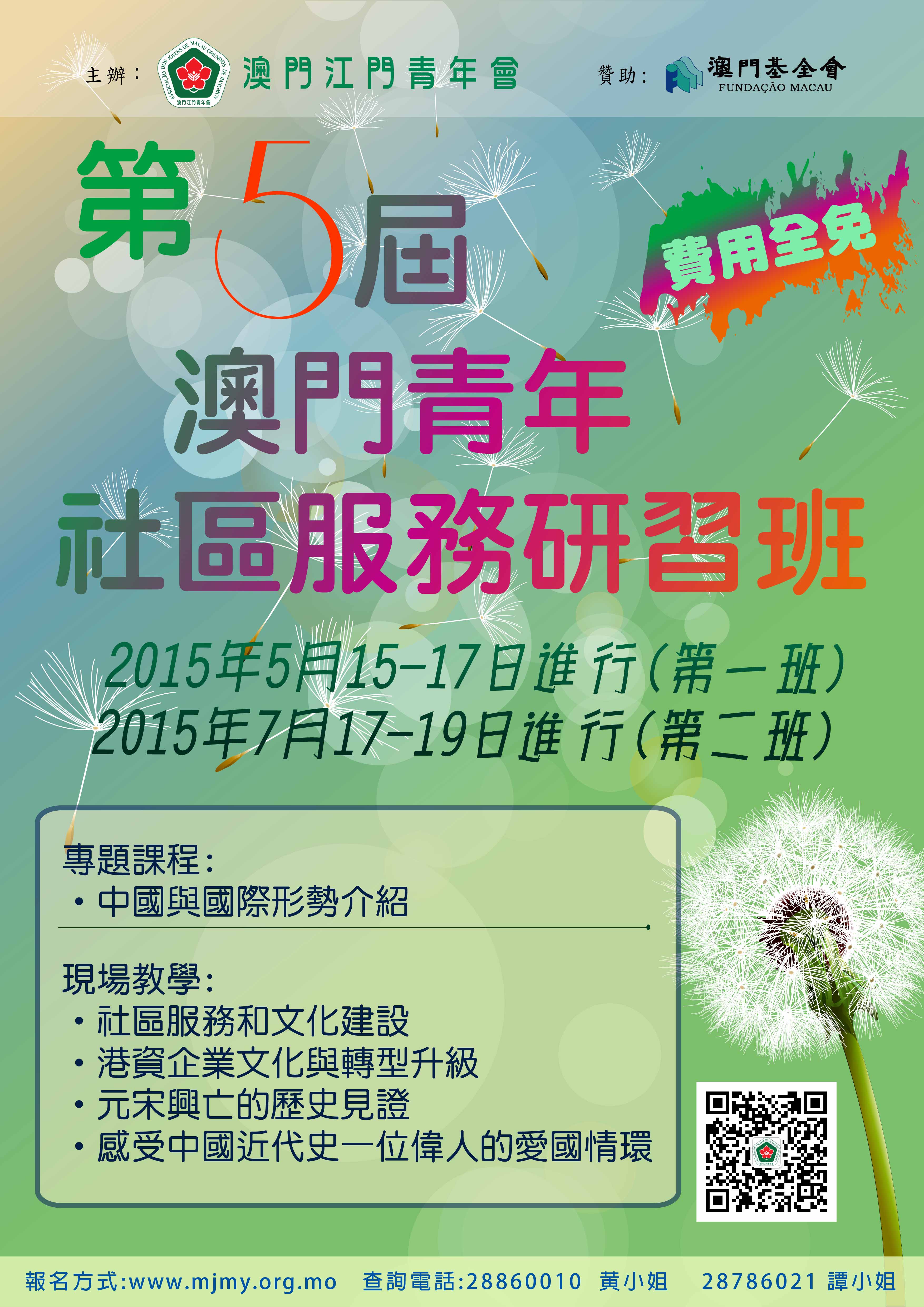第五屆澳門青年社區服務研習班(第一班)現正接受報名!報名時間由即日起至2015年4月26日,心動不如行動!呼朋喚友一齊參與啦!